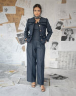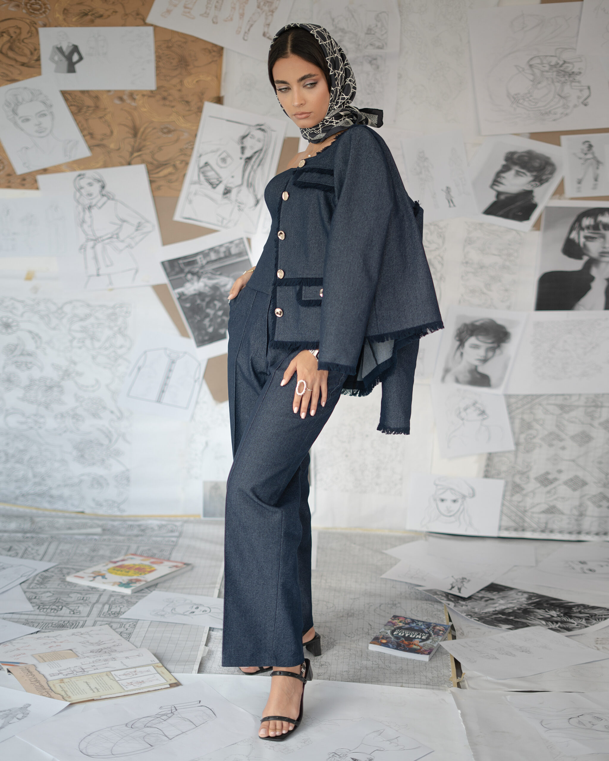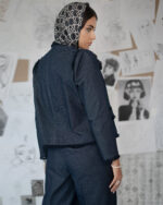 این کت جین سرمهای، ترکیبی است از استایل کلاسیک و نگاهی معاصر. طراحی ساختارمند با دکمههای فلزی براق، شانههایی ظریف و تزئینات ریشریش در لبهها، حس قدرت و زنانگی را همزمان در خود دارد.